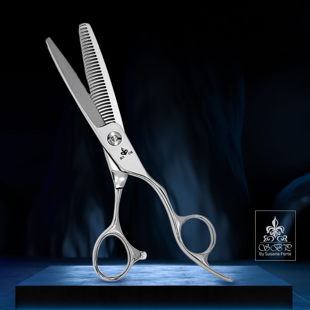 Finalidade: As tesouras de desbaste são usadas para criar uma variedade de efeitos nos cortes de cabelo, como desbaste, texturização, efeitos de camadas suaves e para remover o excesso de volume. Elas são especialmente úteis em cortes de cabelo longos e espessos, ou para terminação de cortes curtos.